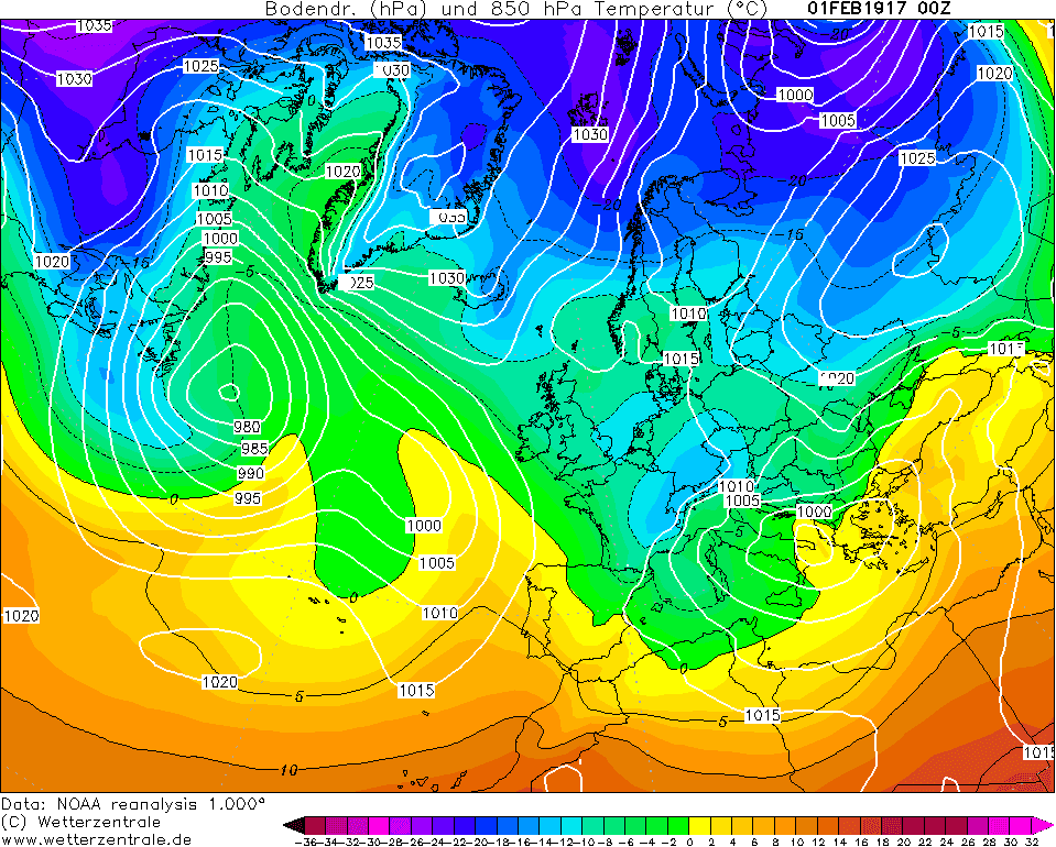 Carte NOAA de la température à 850 hPa, en date du 1er février 1963.