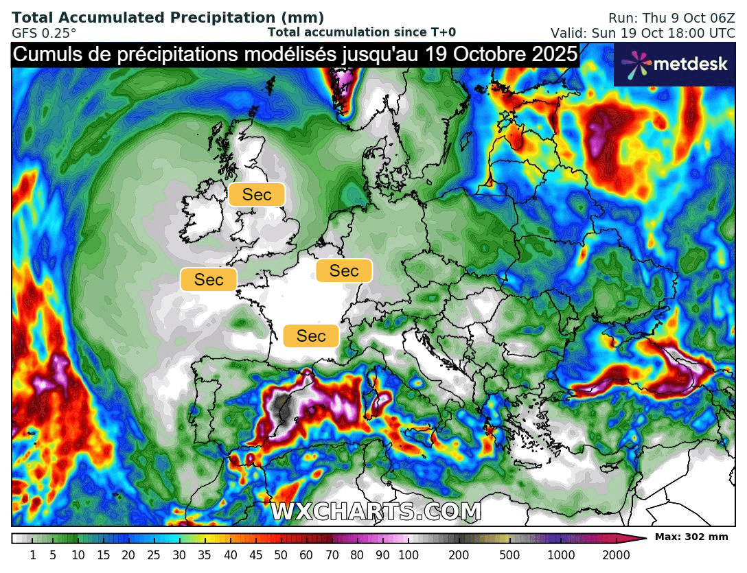 La conséquence première est l'absence quasi-totale de pluie. La modélisation des précipitations pour les 10 jours à venir est sans appel : la plupart des régions françaises ne devraient recevoir aucune goutte de pluie ! Quelques averses seront possibles entre les Alpes et la Corse et vers les Pyrénées. Ainsi, le bilan des deux premières décades d'octobre 2025 promet d'être particulièrement sec sur la France, à une saison pourtant supposée favoriser la recharge des nappes phréatiques.
