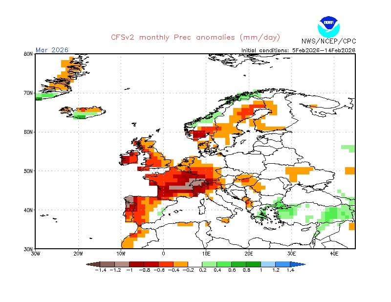 Anomalies de précipitations prévues pour le mois de mars 2026 - CFS