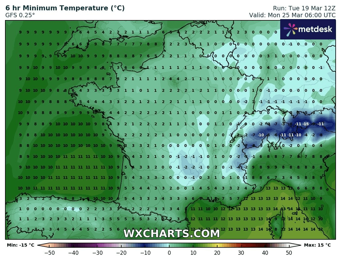 Températures minimales pour le lundi 25 mars 2024 - via wxcharts.com