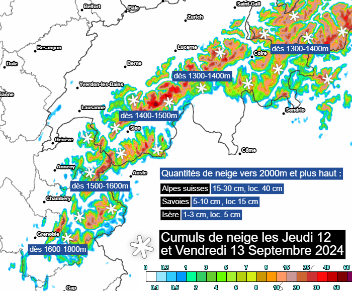 Avec cette masse venue des régions nordiques, la limite pluie/neige va donc chuter drastiquement ce jeudi 12 septembre 2024. Au fil des heures de la journée, elle s'abaissera de 2000 vers 1500 mètres dans les Savoies, plutôt vers 1600-1700 mètres en Isère. Vendredi, il neigera souvent dès 1500 mètres sur ces zones et parfois dès 1300-1400 mètres dans les Alpes suisses ! Les stations de moyenne montagne vont donc connaître leur premier manteau blanc de la saison. Au dessus de 2000 mètres, il pourra tomber 1 à 3 cm (loc. 5 cm) en Isère, 5 à 10 cm (loc. 15 cm) dans les Savoies et jusque 15 à 30 cm (loc. 40 cm) dans les massifs alpins suisses ! Ce sont les versants exposés au nord-ouest qui seront les plus touchés (peu de neige en versants sud).
