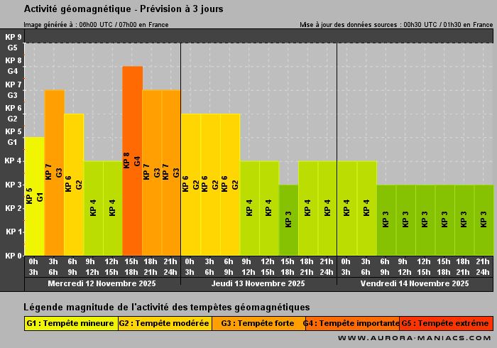 Kp index prévu du mercredi 12 au vendredi 14 novembre 2025 - Aurora-Maniacs