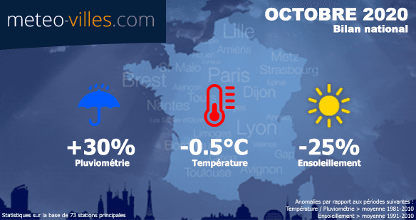 Comme à chaque début de mois, nous vous proposons un bilan climatologique du mois écoulé. Place donc au bilan cartographié du mois de OCTOBRE 2020 en terme de température, pluviométrie et ensoleillement sur un panel de 73 stations*.