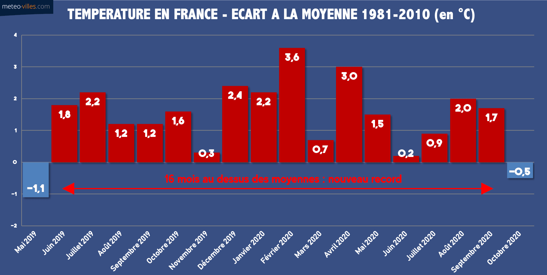 C'est fait, et nous pouvons dire : ENFIN ! Après une série incroyable et jamais vue jusqu'alors de 16 mois consécutifs au dessus des moyennes, ce mois d'octobre a été marqué par la fraîcheur ! Avec un bilan national de -0.5°C, il fallait remonter au mois de mai 2019 pour trouver trace d'un mois sous les normes...