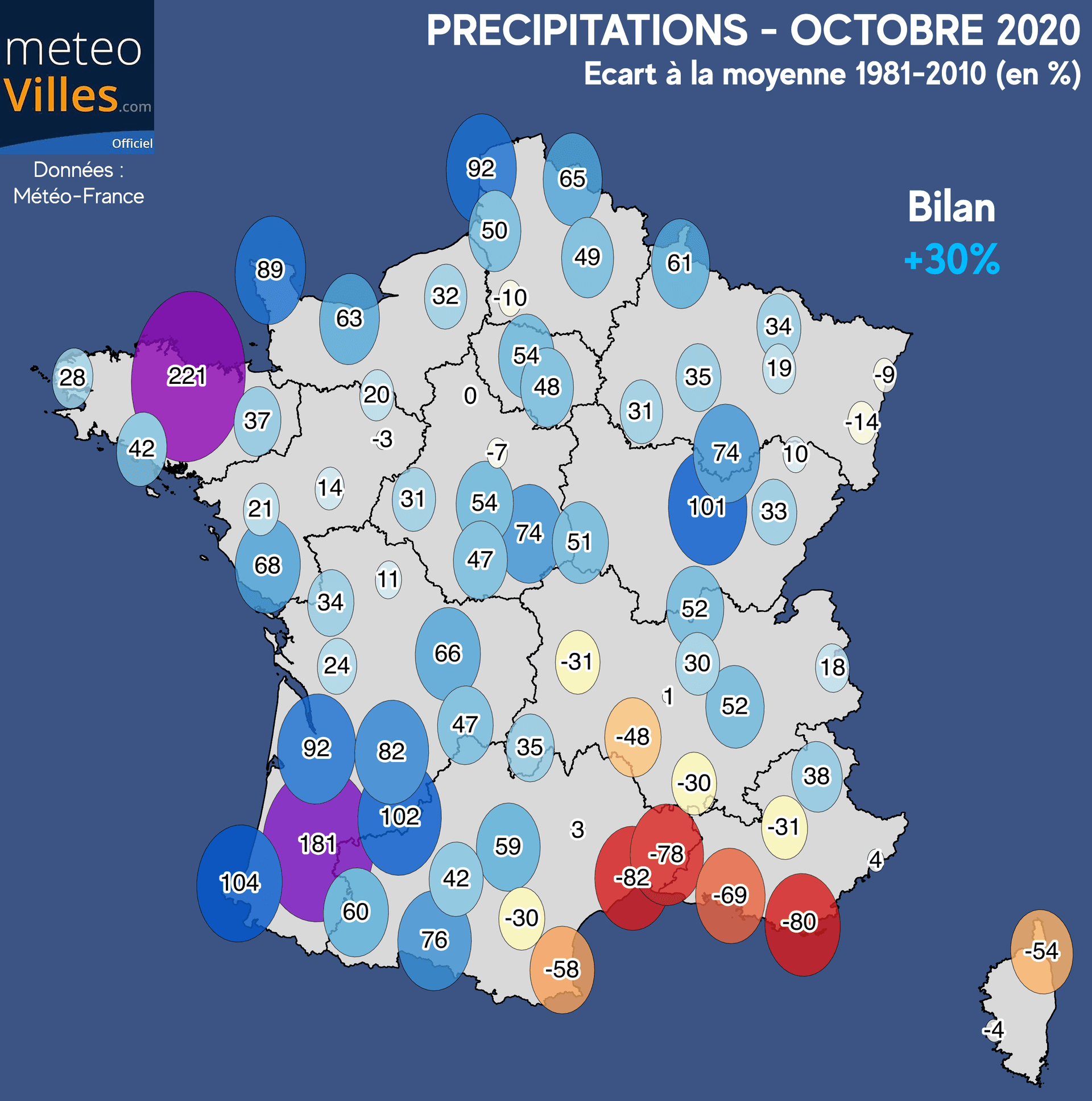 Des pluies même remarquables sur l'Aquitaine (plus de 2 fois la norme, jusqu'à +181% à Mont-de-Marsan), ainsi que sur les Côtes d'Armor (+221% à St-Brieuc, soit 3.2 fois la norme). A Paris-Montsouris, cette anomalie a atteint +54%
