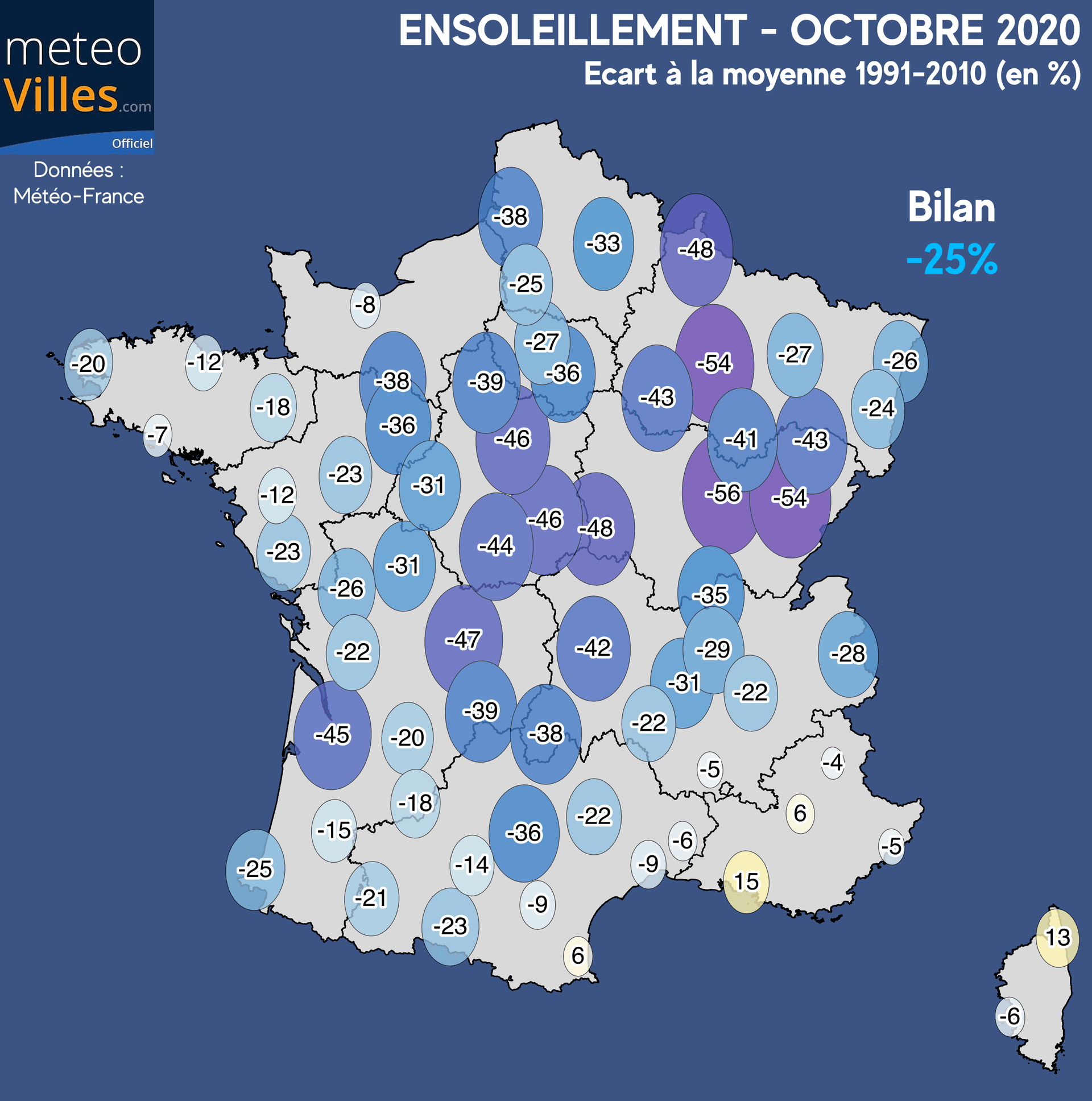 De la fraîcheur, des pluies... il ne fallait plus qu'une absence de soleil pour obtenir le combiné gagnant d'un mois maussade : le déficit d'ensoleillement a atteint -25% à l'échelle national sur notre panel de stations. Les seules (et très rares) villes a avoir atteint leur insolation moyenne se situent dans le quart Sud-Est, avec un léger excédent de +15% à Marseille-Marignane et +13% à Bastia.