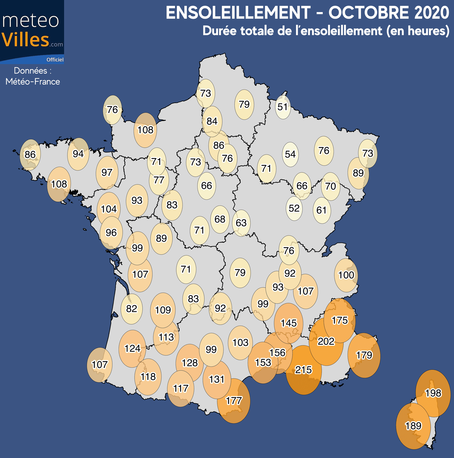 Ce déficit remarquable se traduit par une durée totale de l'ensoleillement inférieure à 100 heures sur la très grande majorité de la moitié Nord de la France (86h à Paris). Dans le Nord-Est, nous avons tout juste réussi à franchir les 50 heures cumulées (soit moins de 2h de soleil par jour) : 51 heures à Charleville-Mézières, 52 heures à Dijon, 54 heures à Saint-Dizier, 60 heures à Besançon.