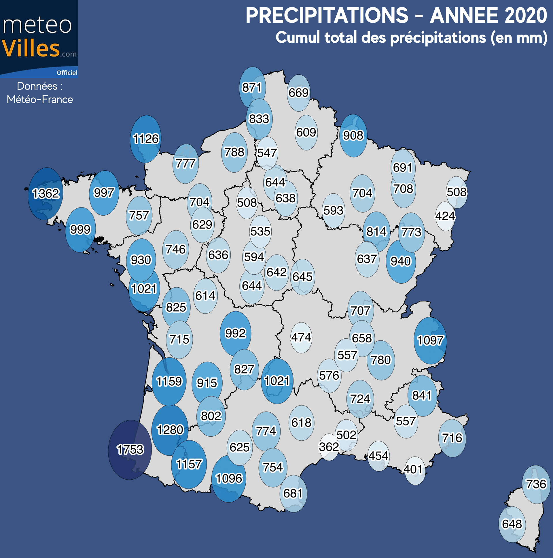 Comme souvent, les cumuls les plus bas ont été observés sur quatre zones : le pourtour Méditerranéen (seulement 362mm à Montpellier, 401mm à Hyères, 454mm à Marseille-Marignane), en plaine Alsacienne (424mm à Colmar, 508mm à Strasbourg), autour de la Limagne (474mm à Clermont-Ferrand), ainsi que dans le Centre/Bassin Parisien (508mm à Chartres, 535mm à Orléans). Pour Paris, le cumul a atteint 644mm, contre une moyenne de 637mm.