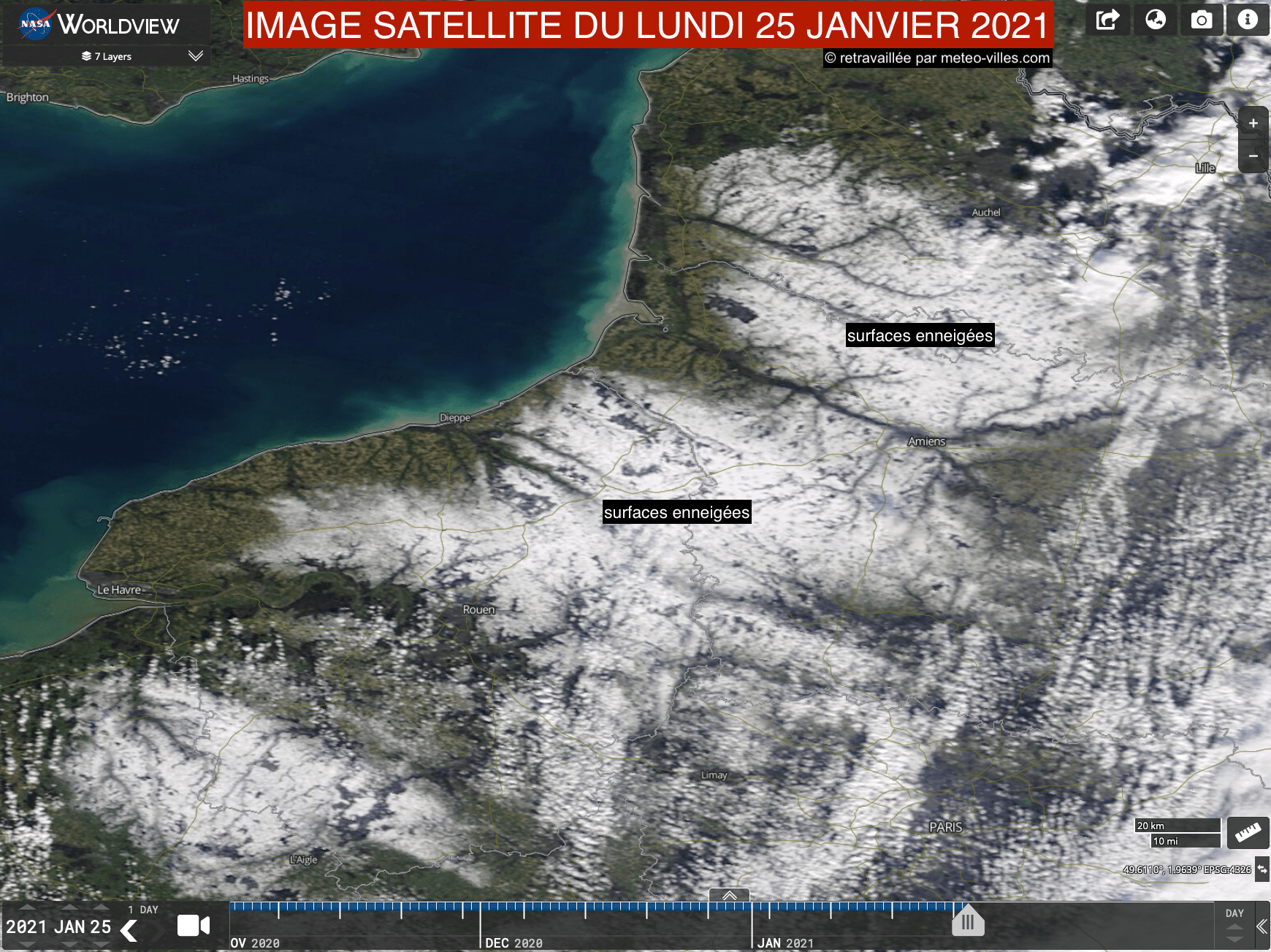Alors que le soleil revient peu à peu sur la moitié Nord, les chutes de neige de la veille sont visibles par satellite, notamment entre l’intérieur de la Normandie, des Hauts-de-France et sur l’Angleterre. Cette couche neigeuse font peu à peu au fil des heures mais devrait persister plus longuement sur les reliefs normands.