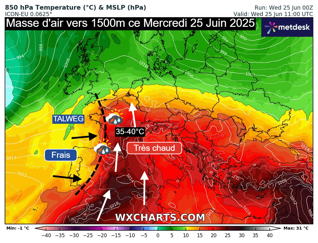 Masse d'air à 850 hPa (vers 1500m) ce mercredi 25 juin 2025 - wxcharts.com