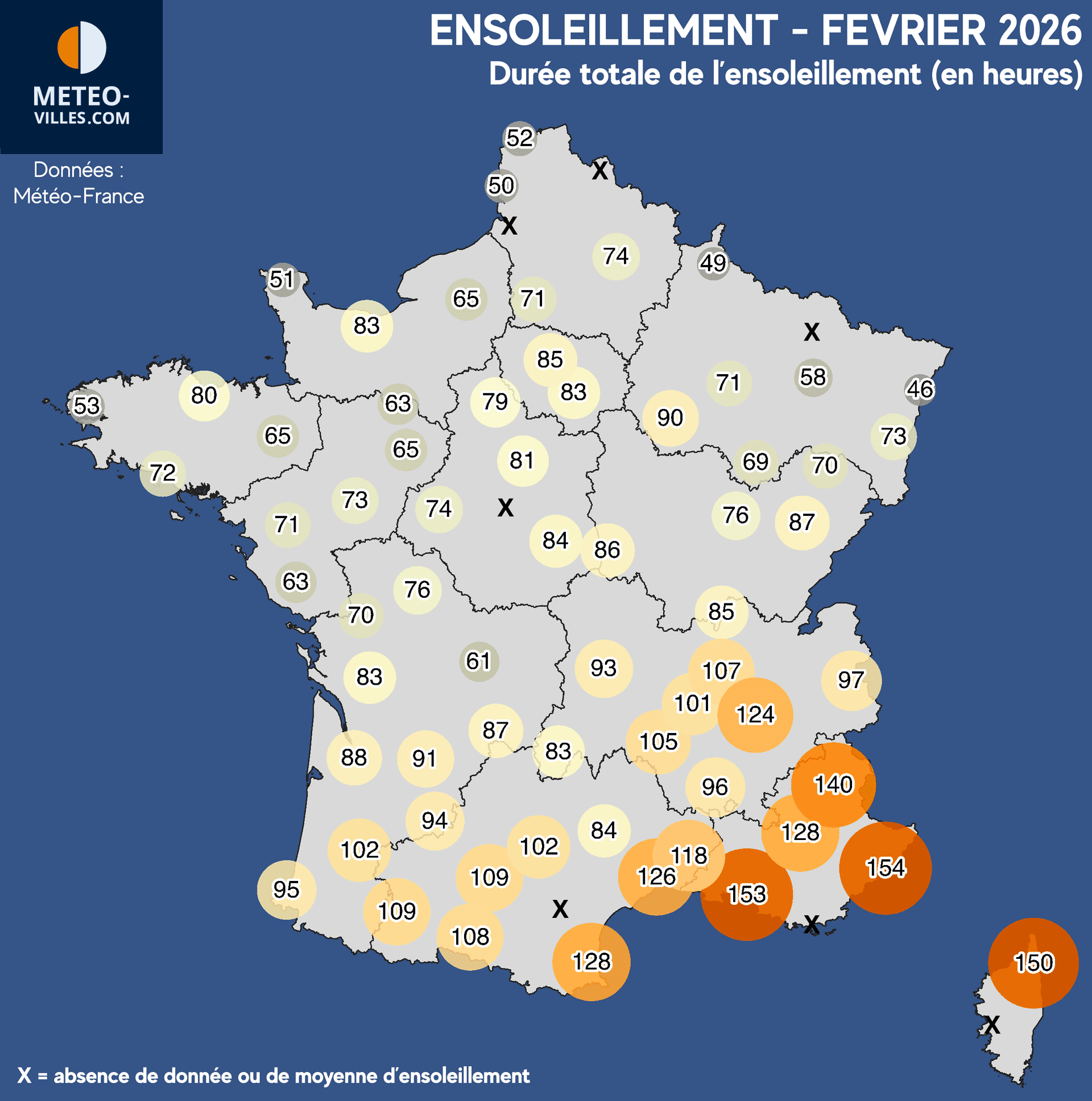 Seules les régions les plus au Sud sont parvenues à obtenir plus de 100 heures de soleil au cours du mois (Occitanie, Provence, Côte d'Azur, Rhône-Alpes, Corse). Les maximums ont été observés à Bastia (150h), Marseille (153h) et Nice (154h).