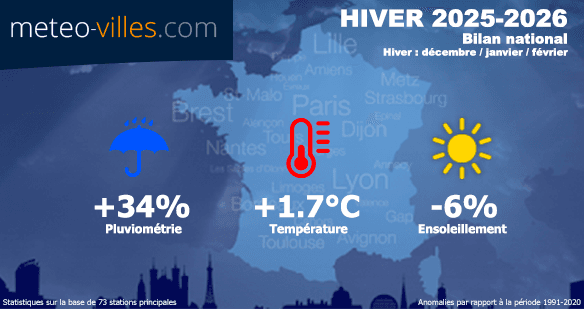 Comme à chaque début de mois, nous vous proposons un nouveau bilan climatologique. Place désormais au bilan cartographié de l' HIVER METEOROLOGIQUE 2025-2026 en termes de température, pluviométrie et ensoleillement. Les anomalies présentées sont calculées à partir des moyennes climatiques de la période de référence 1991-2020 sur l'ensemble des stations du panel.