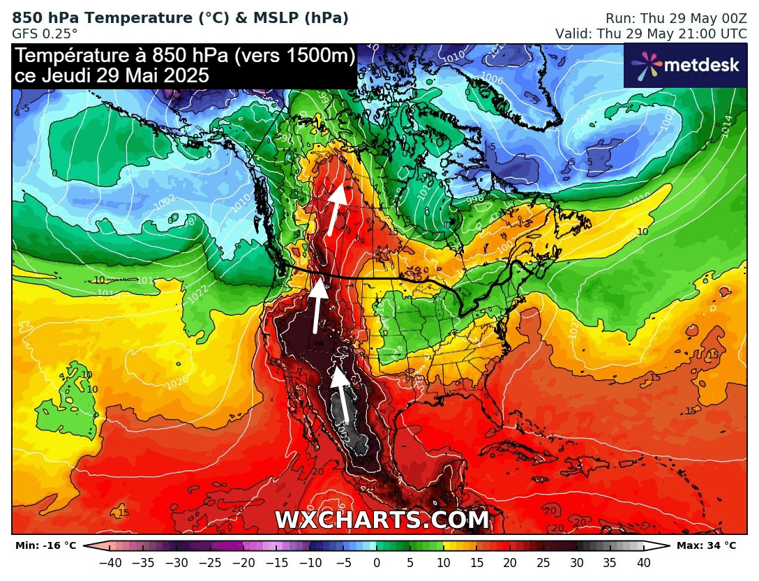 Une vague de chaleur précoce concerne le Canada en cette fin du mois de mai 2025. Dans les prochaines heures, les températures vont atteindre 35°C jusqu'à des latitudes élevées !