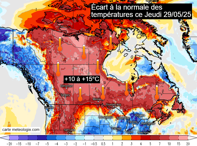 La carte ci-dessous permet de montrer l'écart à la normale des températures ce jeudi 29 mai 2025. Dans toutes les provinces canadiennes pré-citées, nous serons souvent entre 10 et 15°C au dessus des moyennes de saison avec parfois 35°C quand la normale n'est que de 20°C ! On constate qu'une grande partie du Canada surchauffe en cette fin mai puisque des anomalies de +10°C sont également mesurées jusqu'au Québec dans l'est du pays.