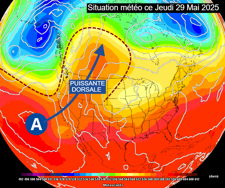 Le coupable des températures anormalement élevées sur le Canada en cette fin mai 2025 est un anticyclone situé sur le Pacifique. En effet, ce dernier étend une puissante dorsale sur l'ouest du Canada, apportant des conditions sèches et ensoleillées et faisant remonter un air très chaud jusqu'aux hautes latitudes.