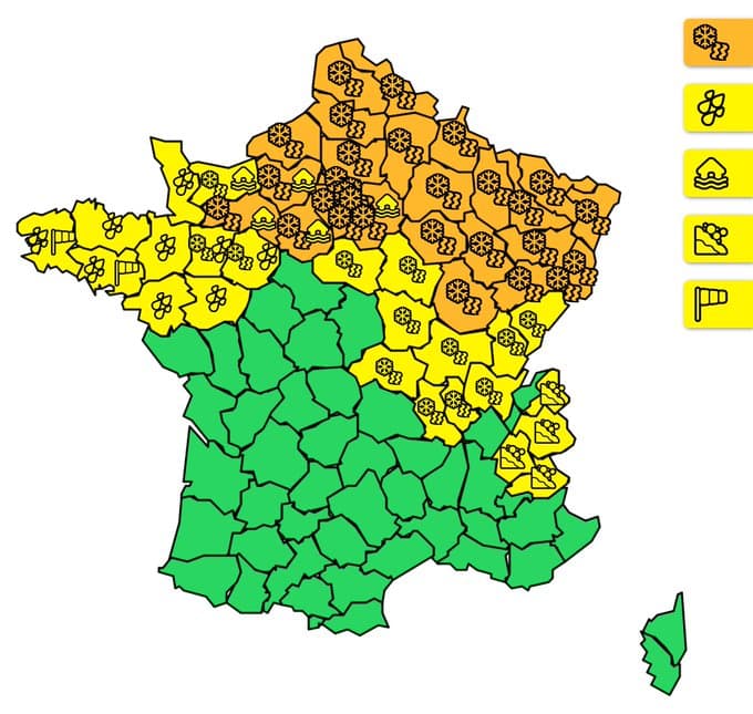 La vigilance orange Météo-France neige/verglas concerne 30 départements durant la soirée du 04 janvier 2025