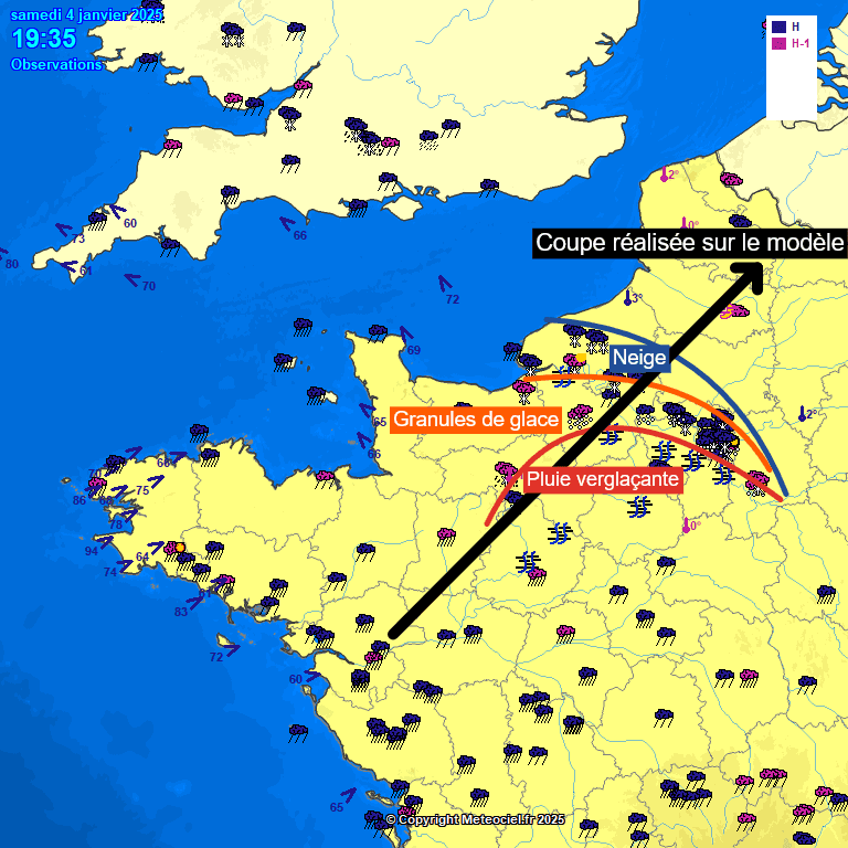Si l'on regarde les observations par rapport à la coupe réalisée sur le modèle à cette heure, l'influence de la langue d'air chaud en altitude sur les types de précipitations observés est évident.