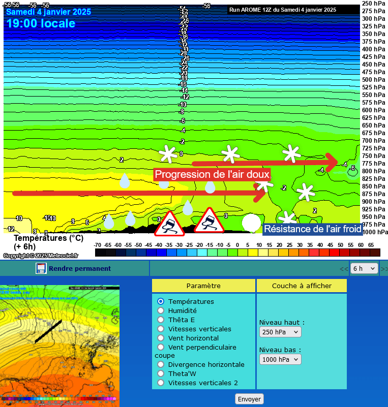 Modélisation en coupe du front chaud de ce 4 janvier 2025 à 19h - Arome/Meteociel