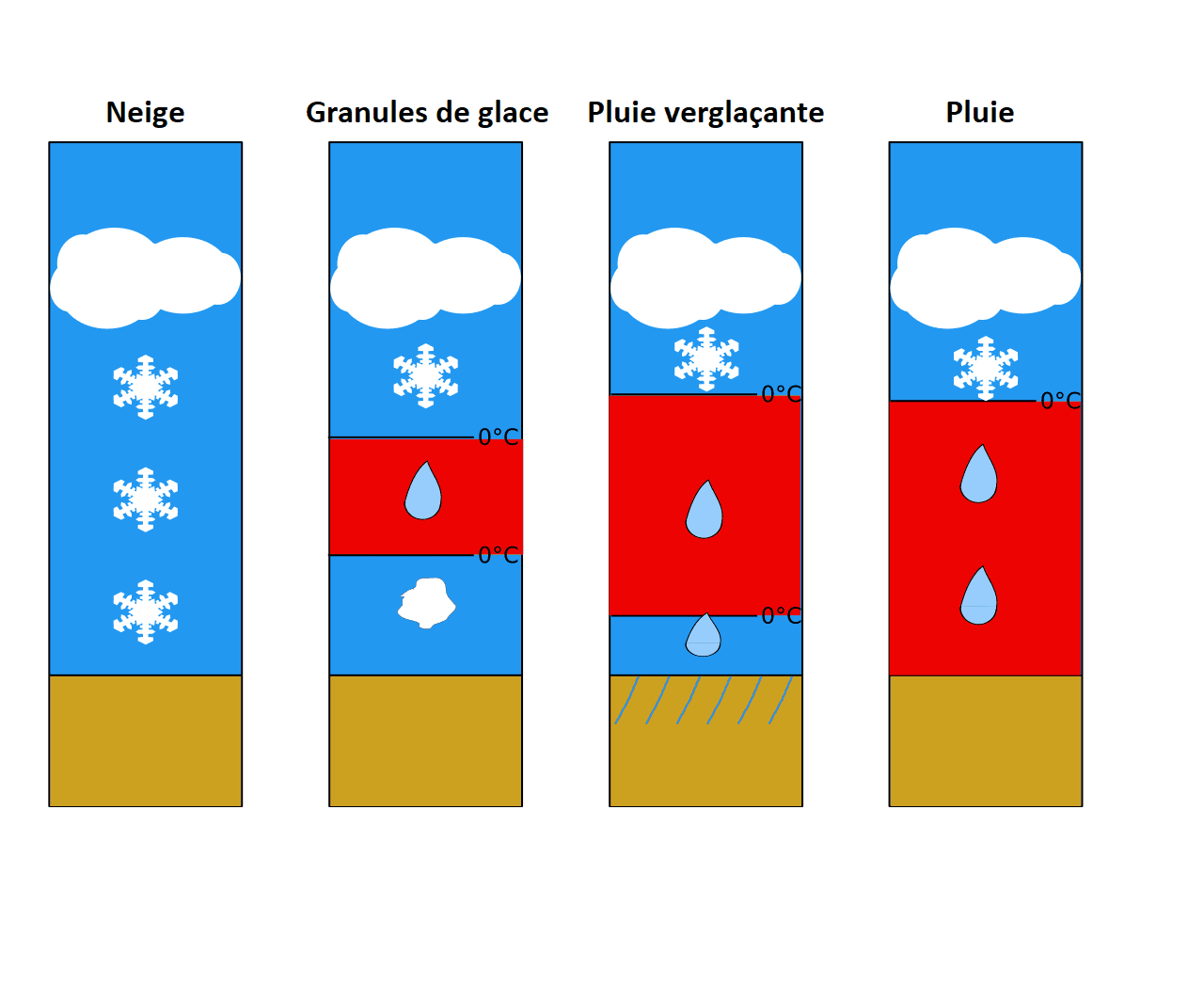 - Si la couche d'air froid proche du sol reste suffisamment épaisse, la pluie regèlera et il tombera des granules de glace.