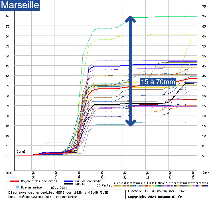 A Marseille, des cumuls de 15 à 70mm sont attendus, avec une médiane située autour de 35mm.