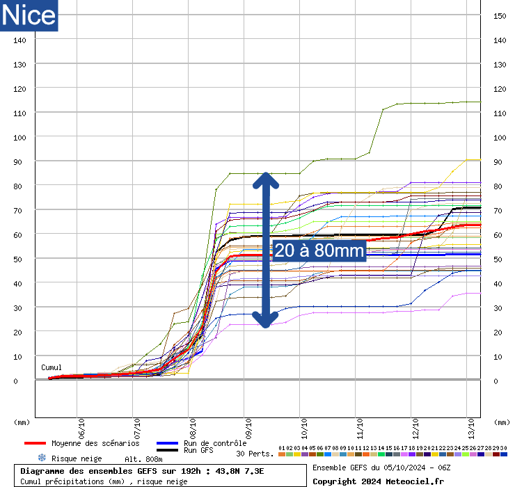A Nice, des cumuls de 20 à 80mm sont attendus, avec une médiane située autour de 55/60mm.
