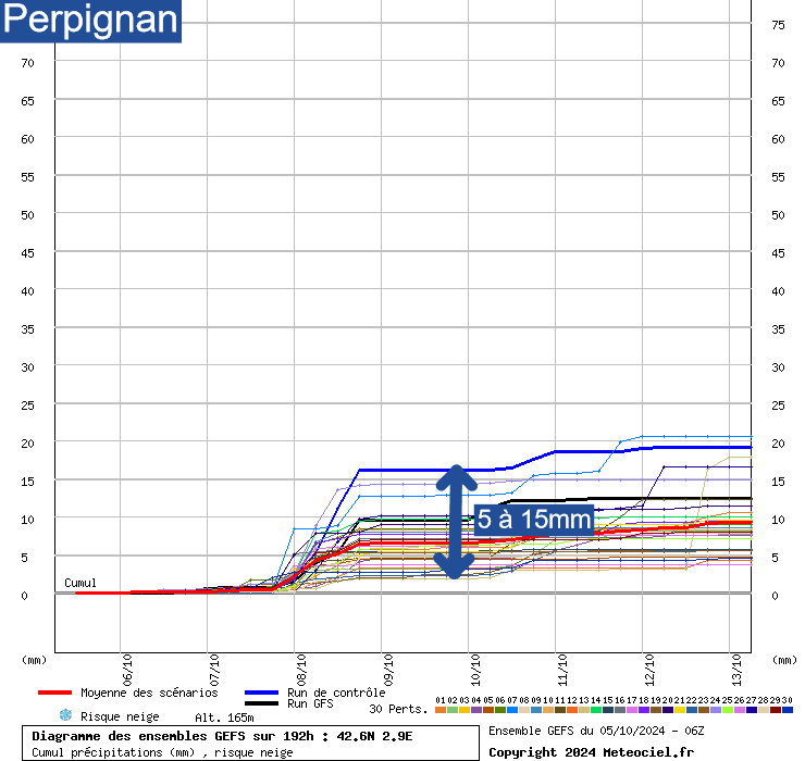 A Perpignan, des cumuls de 5 à 15mm sont attendus, avec une médiane située entre 5 et 10mm.