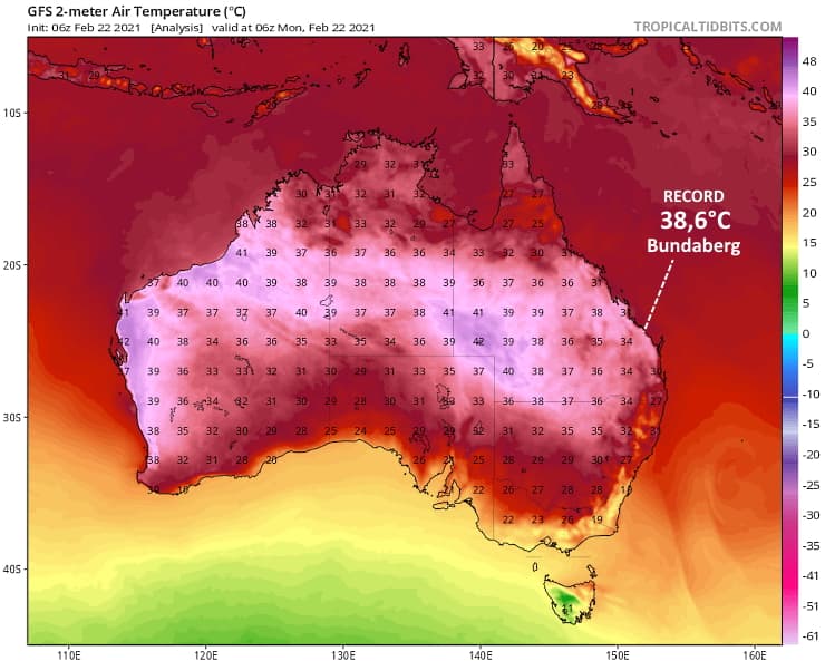 Températures en Australie en après-midi du lundi 22 février 2021 - via tropicaltidbits.com