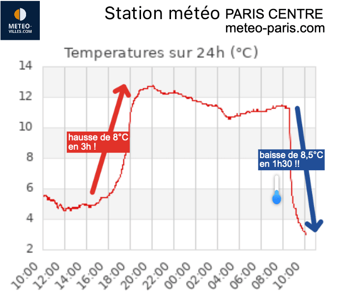 Certaines régions du nord ont été concernées par plusieurs changements brutaux de masses d'air au cours des deux derniers jours. C'est par exemple le cas de l'Île-de-France. Après une domination du froid le mercredi 8 janvier 2025, Paris a brutalement basculé dans l'air doux en soirée avec une température passant de 5 à 14°C en quelques heures ! Après une nuit très douce, l'air froid est revenu brutalement (occlusion) en milieu de matinée du jeudi 9 janvier 2025 avec une baisse de 8,5°C en 1h30 (et quelques flocons mêlés à la pluie) !