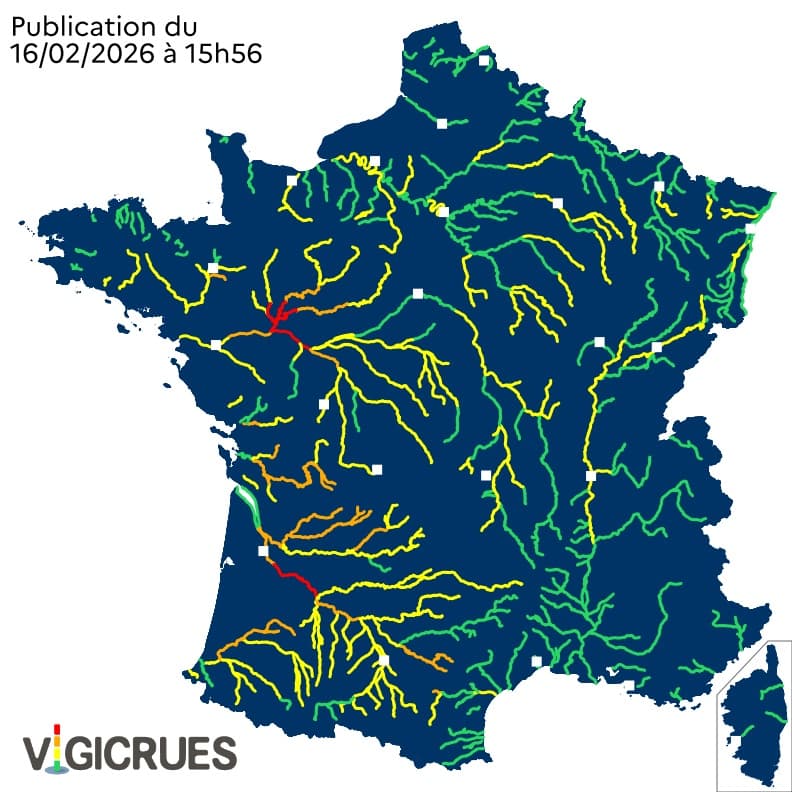 Carte vigicrue du 16 février 2026 à 16h - Vigicrues