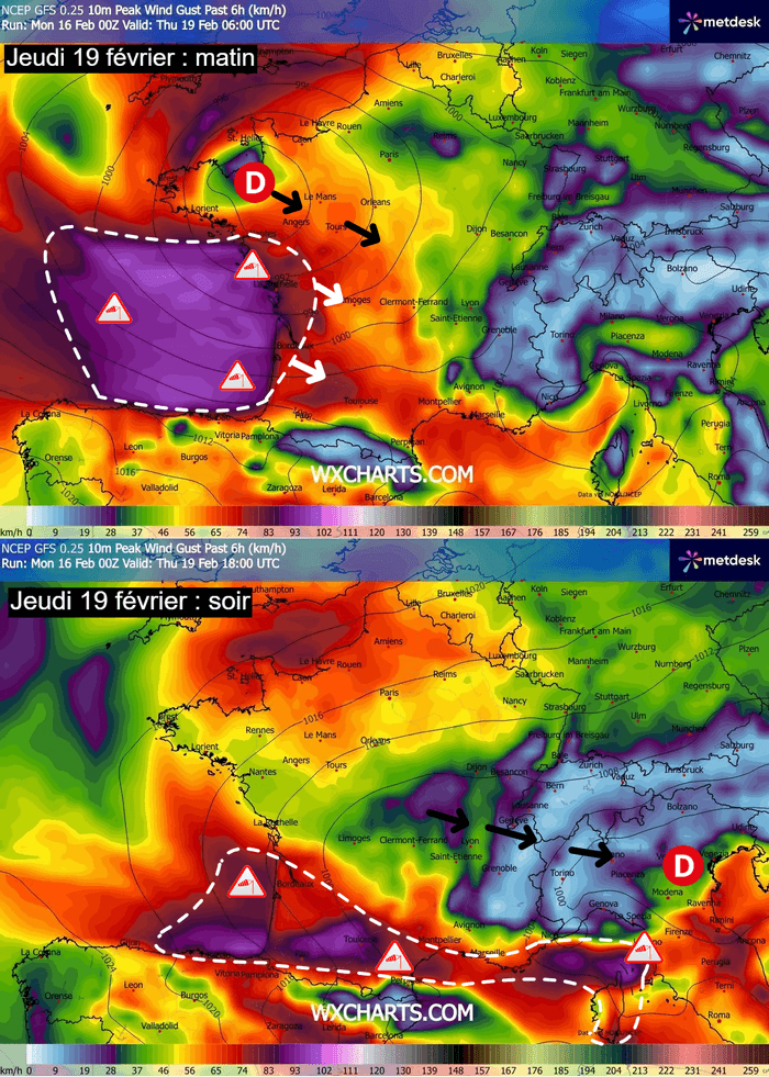 C'est donc notamment entre la façade Atlantique, le sud-ouest et les abords de la Méditerranée que les rafales les plus fortes sont attendues entre mercredi soir et jeudi avec parfois plus de 90-100 voire 110km/h sur les secteurs les plus exposés. Ceci restera néanmoins à confirmer d'ici là.