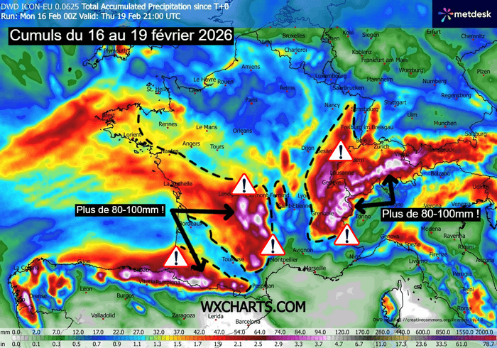 Cumuls de précipitations attendus jusqu'au jeudi 19 février au soir – Modèle ICON-EU via WX CHARTS