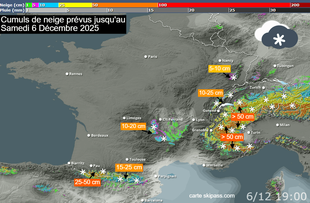 La mise en place d'un courant océanique perturbé apportera le passage de multiples fronts dès ce dimanche 30 novembre 2025 et au cours de la première semaine du mois de décembre. La limite pluie/neige sera fluctuante au gré du passage des fronts mais il neigera fréquemment à partir de moyenne montagne, concernant souvent les stations. D'ici la fin de la semaine prochaine, on pourrait avoir 5 à 10 cm sur les sommets des Vosges, 10 à 25 cm sur les sommets du Jura, de l'ouest du Massif Central et de l'est des Pyrénées, 25 à 50 cm sur les sommets de l'ouest des Pyrénées et plus de 50 cm dans les stations alpines. Dans les stations les plus basses, quelques passages pluvieux pourront parfois être observés, pouvant tasser la neige.