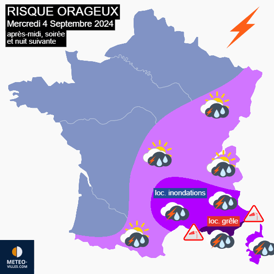 Risque orageux en après-midi & soirée du mercredi 4 septembre 2024 et nuit suivante - Météo Villes