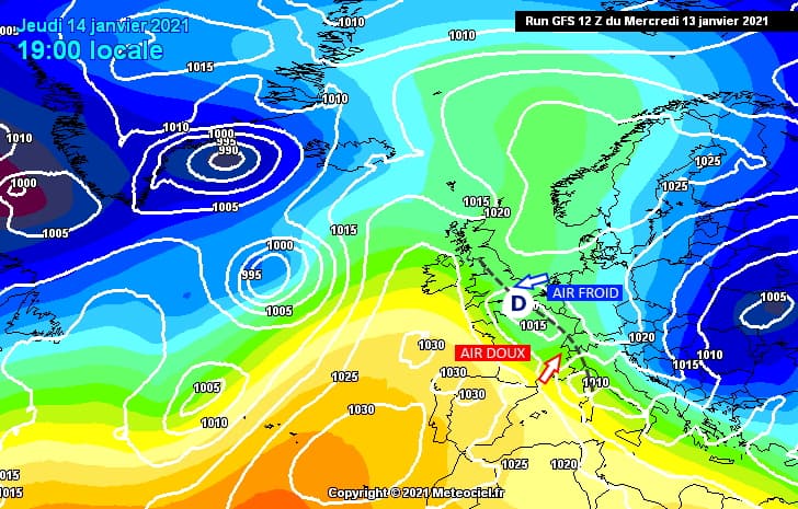 Situation à échelle continentale ce jeudi 14 janvier 2021 - modèle GFS via meteociel.fr