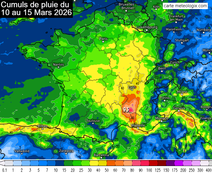 Cumuls de pluie modélisés du mardi 10 au dimanche 15 mars 2026 - meteologix.com