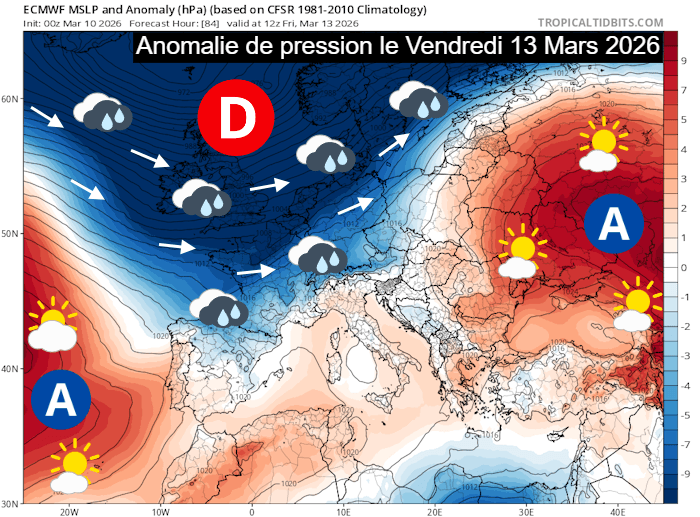 Anomalie de pression prévue pour le vendredi 13 mars 2026 - tropicaltidbits.com