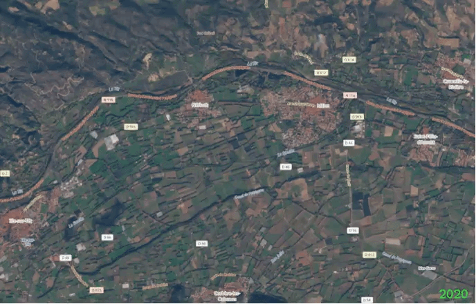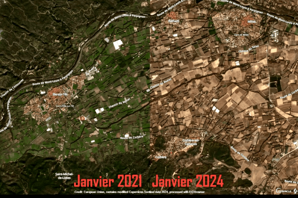 Evolution de la sécheresse dans les Pyrénées Orientales - Images Satellites de janvier 2021 et Janvier 2024 @SergeZAKA Twitter