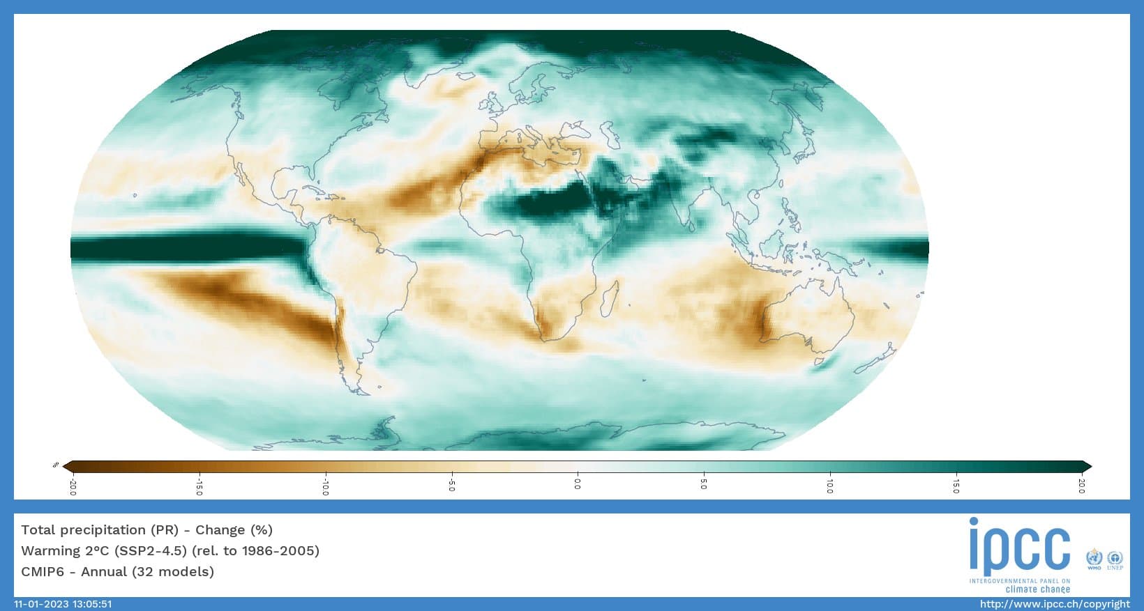 Variation des précipitations attendues en % avec un réchauffement de +2°C - IPCC. Nous pouvons voir une forte diminution du Maroc à la Péninsule Ibérique jusqu'aux Régions Méditerranéennes françaises.