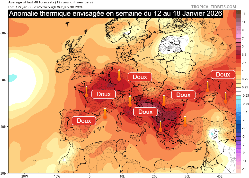 Plus que le bref redoux actuel, c'est donc le redoux attendu la semaine prochaine qui s'annonce bien plus marquant. L'anomalie thermique pourrait être assez nette sur la France lors de cette semaine du lundi 12 au 18 janvier 2026 avec un écart de +2 à +4°C. Cela signifie que les gelées deviendront rares et que les après-midi seront doux avec des températures atteignant et dépassant fréquemment la barre des 10°C. Il faut remonter avant la période des fêtes pour retrouver une telle douceur.