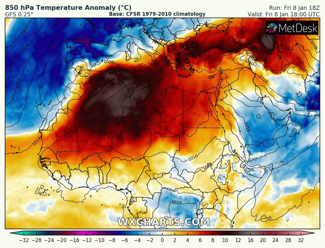Du froid et de la neige sur le flanc Ouest de la dépression... mais une grande chaleur signe de l'été sur le flanc Est ! En effet, cette dépression Filomena a provoqué en parallèle une remarquable impulsion d'air Sahararien particulièrement chaud ce week-end sur l'Est du Maghreb, puis sur le centre de la Méditerranée, avant d'atteindre la Grèce. L'anomalie de température de la masse d'air dépasse alors les +15°C entre Tunisie, Malte, Sicile et Grèce ce week-end.