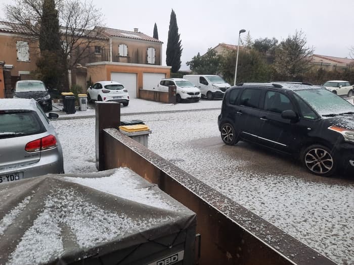 Les grêlons ont parfois atteint 2cm de diamètre près de Montpellier ce dimanche 22 mars avec d'importantes accumulations au sol – Photographie : Christine Jnn à Saint-Jean-de-Védas (34)