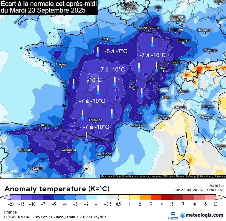 Après les chaleurs tardives enregistrées jusqu'à samedi dernier, les températures se sont effondrées dès dimanche et plongent sous les normales. Les températures qui concernent actuellement la France se situent très largement en dessous des normales de saison. Cet après-midi du mardi 23 septembre 2025, le déficit atteindra souvent -7 à -10°C du sud-ouest au nord-est de la France ! Une telle anomalie fraîche devient rare à l'ère du réchauffement climatique.