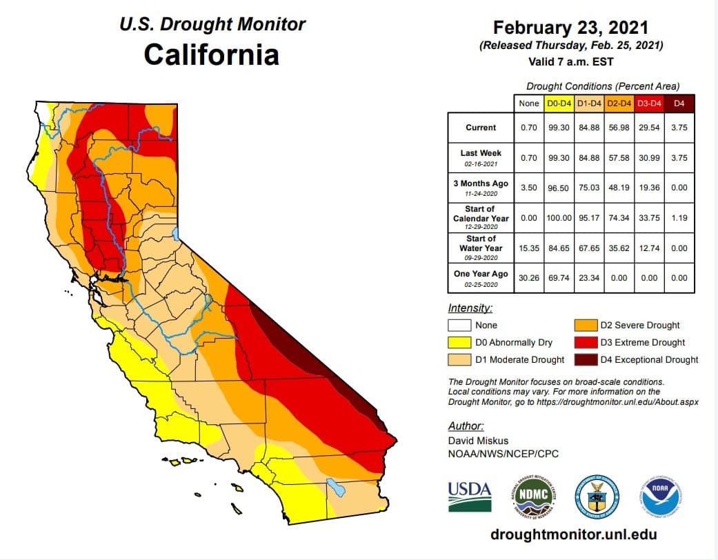 Etat de sécheresse des sols de l’état de Californie à la fin du mois de février - Via droughtmonitor.unl.edu
