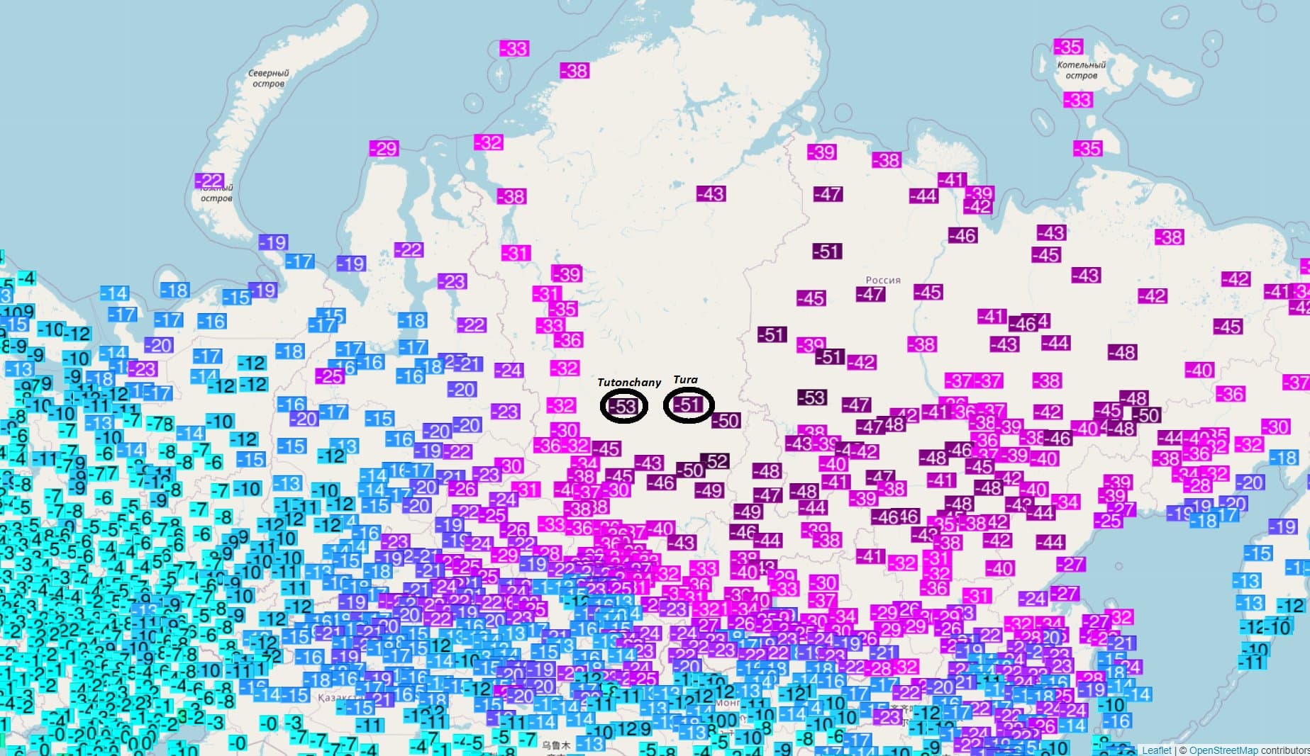 - -53.0°C Tutonchany (ancien record de -51.5°C le 4mars 1978)