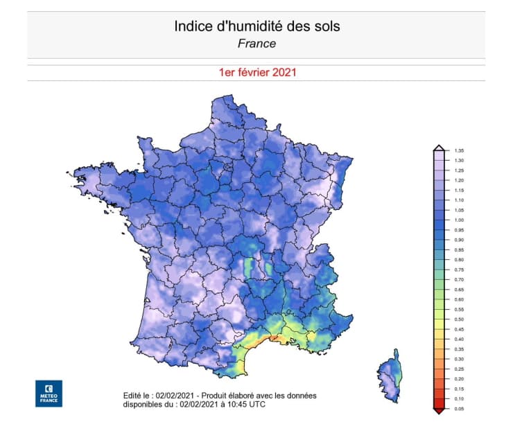 Indice d'humidité des sols en France au lundi 1er février 2021 - via Météo France