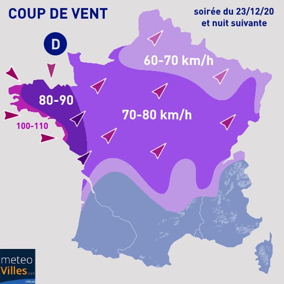 Rafales des rafales maximales attendues le 23 décembre 2020 au soir et la nuit suivante - Météo Villes