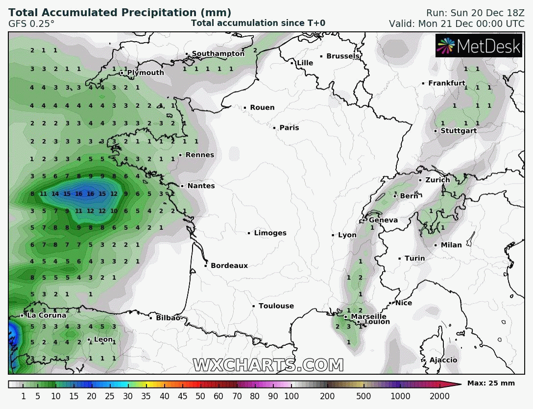 Modélisation des cumuls de pluie du lundi 21 au jeudi 24 décembre 2020 - via wxcharts.com