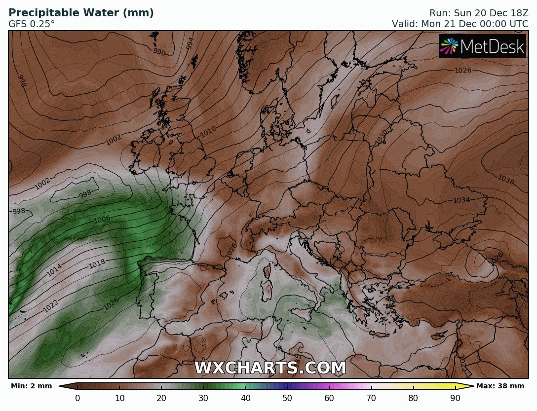Eau précipitable dans l'atmosphère du lundi 21 au mercredi 23 décembre 2020 - via wxcharts.com