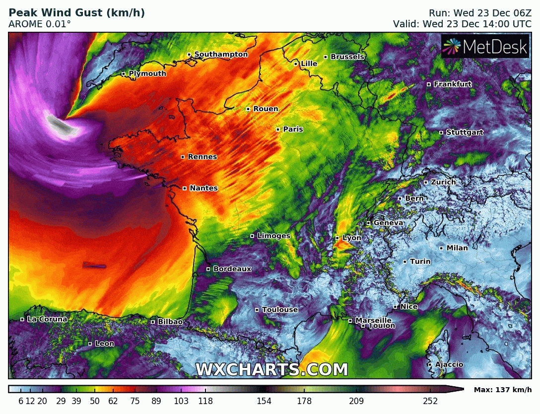 Comme on peut le constater sur l'animation ci-dessus, les rafales les plus importantes touchent la Bretagne ce mercredi en fin de journée. Elles vont s'enfoncer dans les terres du nord-ouest en cours de soirée et de nuit prochaine, poursuivant leur course en direction du nord-est où elles faibliront au lever du jour ce jeudi 24 décembre.