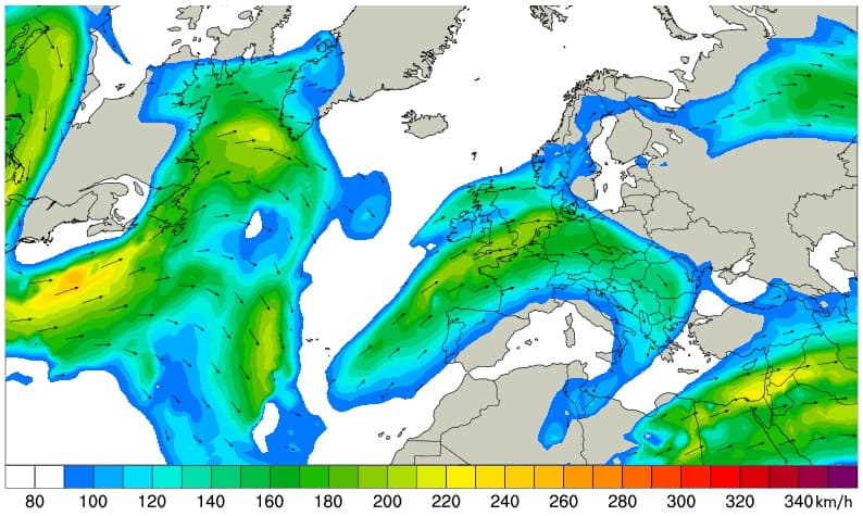 Dans l'hémisphère nord, les vents circulent généralement d'ouest en est. À nos latitudes moyennes, cette circulation peut être accélérée par les contrastes thermiques entre l'air froid près des pôles et l'air chaud près des tropiques. Plus le conflit entre ces deux masses d'air est important, plus la vitesse des vents dans cette circulation atmosphérique se montre virulente. C'est dans cette zone que circule le jet stream, à haute altitude.